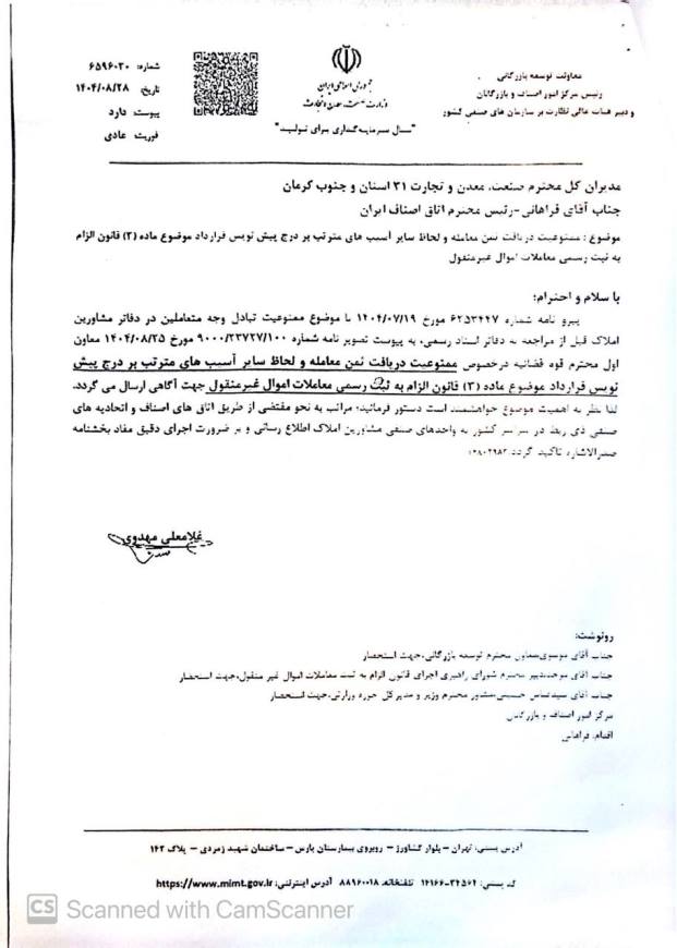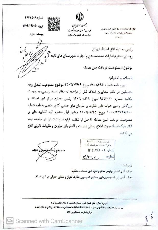 ✅نامه اتاق اصناف تهران درخصوص ممنوعیت دریافت ثمن معامله تا قبل از تنظیم قرارداد و ثبت آن در سامانه ثبت الکترونیک اسناد