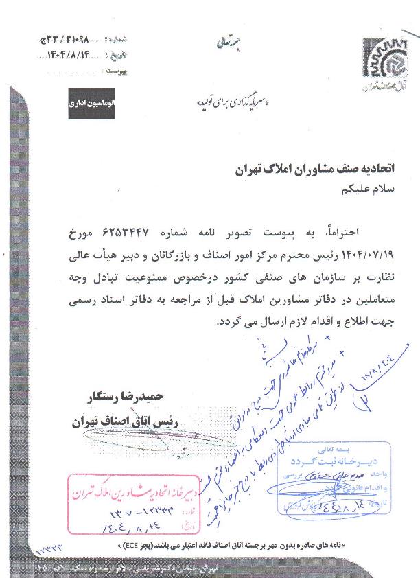 نامه اتحادیه صنف مشاوران املاک تهران به اتاق اصناف ایران درخصوص قانون الزام به ثبت رسمی معاملات اموال غیرمنقول