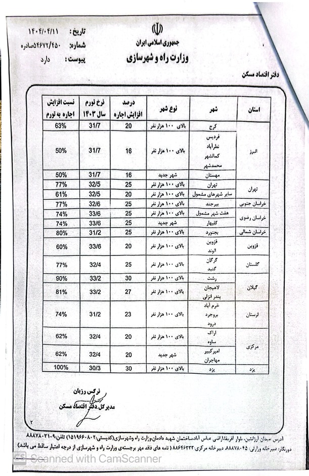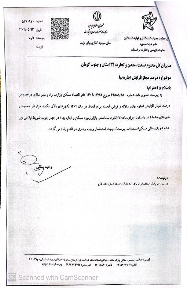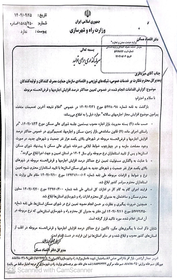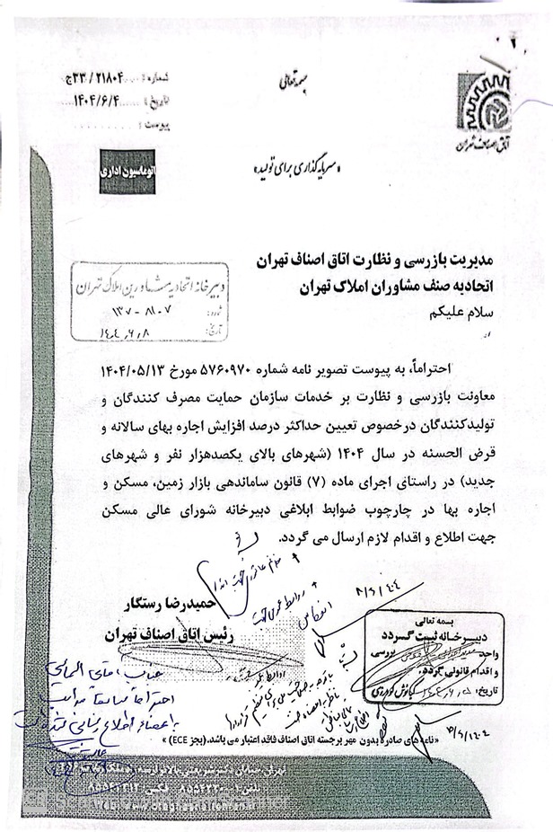 نامه اتاق اصناف تهران درخصوص تعیین حداکثر درصد افزایش اجاره بهای سالانه و قرض الحسنه در سال 1404( شهرهای بالای یکصدهزارنفر و شهرهای جدید )