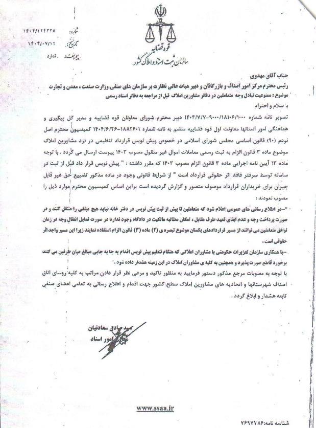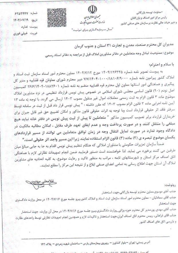 💢بسیارمهم و حائزاهمیت ✅نامه اتاق اصناف تهران درخصوص ممنوعیت تبادل وجه متعاملین در دفاتر مشاوران املاک