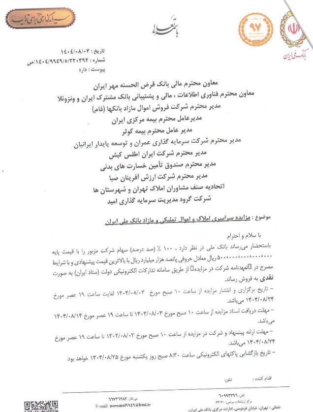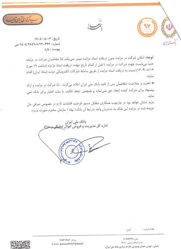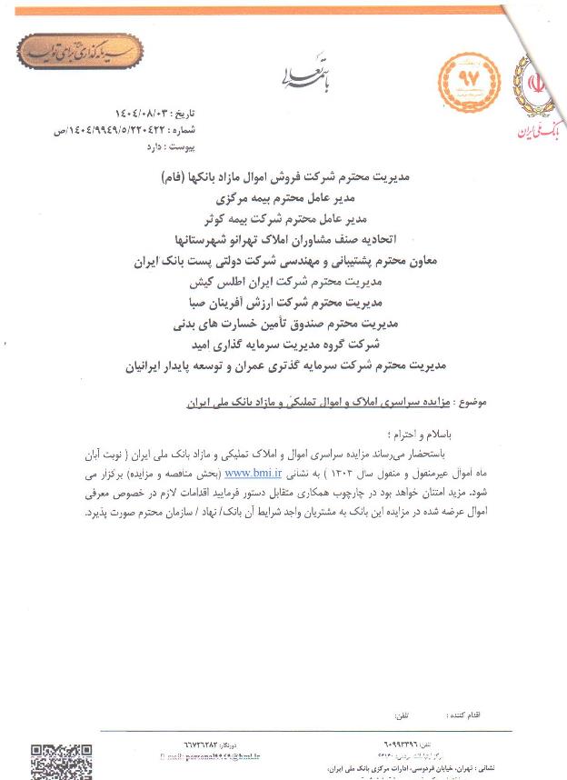 مزایده سراسری املاک و اموال تملیکی و مازاد بانک ملی ایران
